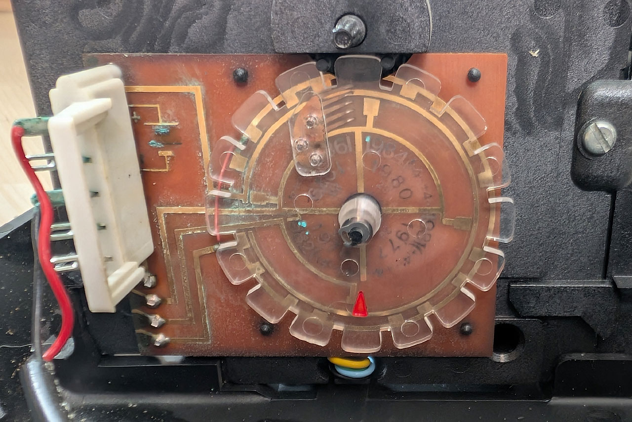 Bei der weißen Uhr war die Situation leider ganz anders. Auf der Kodierscheibe für das Datum befindet sich Grünspan und scheinbar wurde hier schon mal mit einem Stückchen Kabel eine Verbindung repariert. Ein erster Test zeigte außerdem, dass das Datum bei Monaten mit weniger als 31 Tagen nicht richtig funktioniert. Auch hier hat eine Behandlung mit Kontakt 60 und Kontakt WL geholfen.