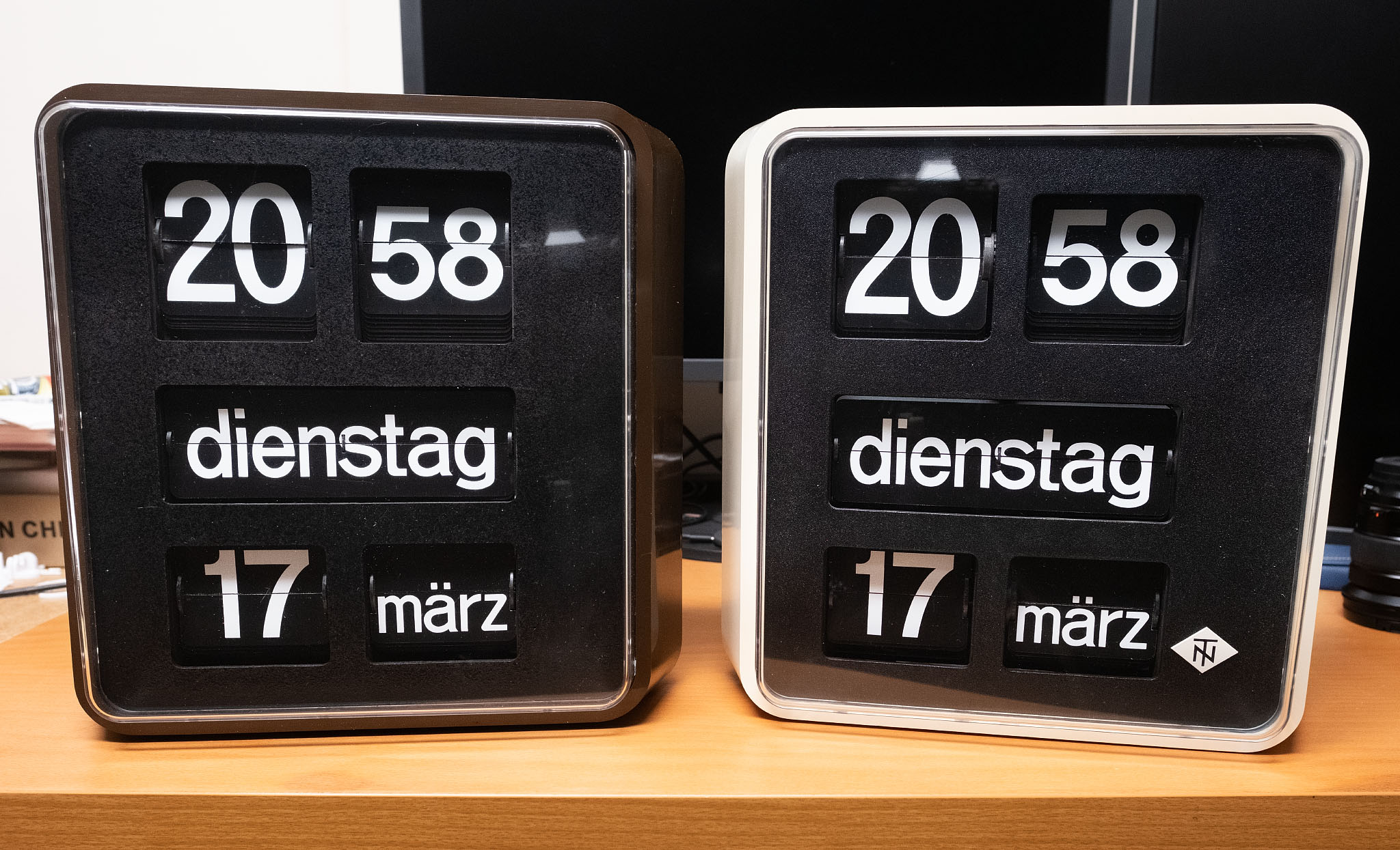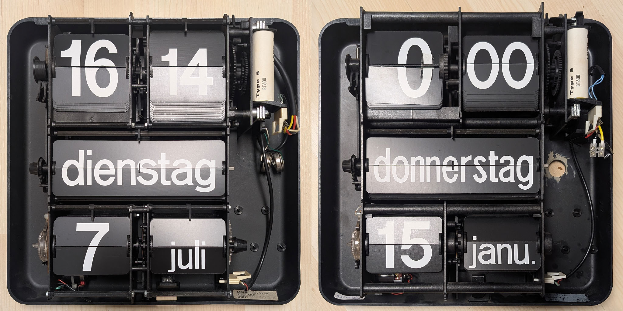 Wie auch bei den kleinen Bodet Klappzahlenuhren weist der innere Aufbau leichte Unterschiede auf. Ein Modell verfügt über Metallstreben, die mit Muttern verschraubt sind, während das andere Modell vollständig aus Kunststoff gefertigt ist.