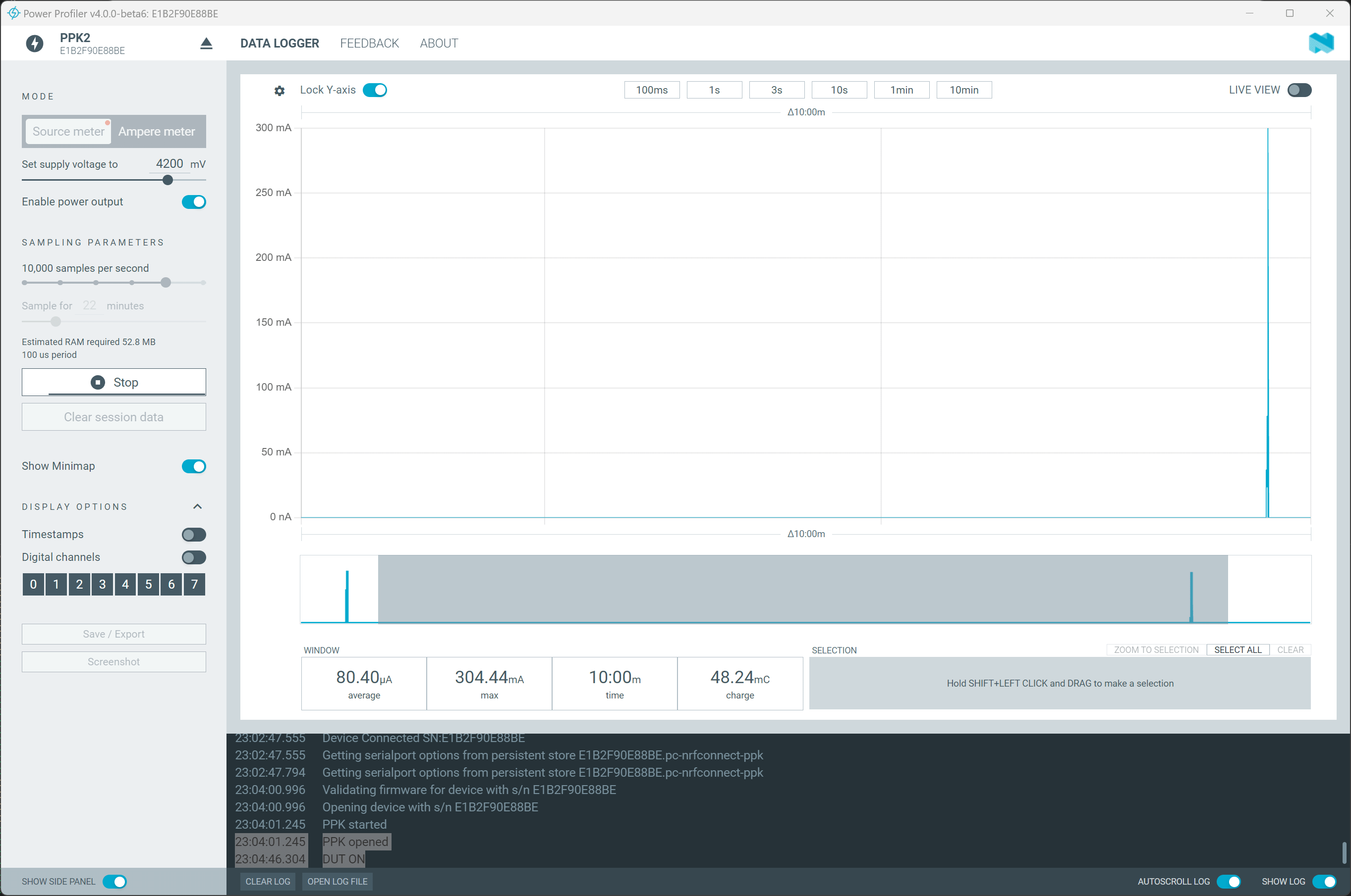 Der letzte Screenshot zeigt schließlich den Durchschnitt über ein Intervall von 10 Minuten. Das ist genau die Zeitspanne, die sich der Sensor im Deep Sleep Modus befindet und anschließend wieder Daten schickt. Der PPK2 gibt hier einen Wert von 80,4 µA an.