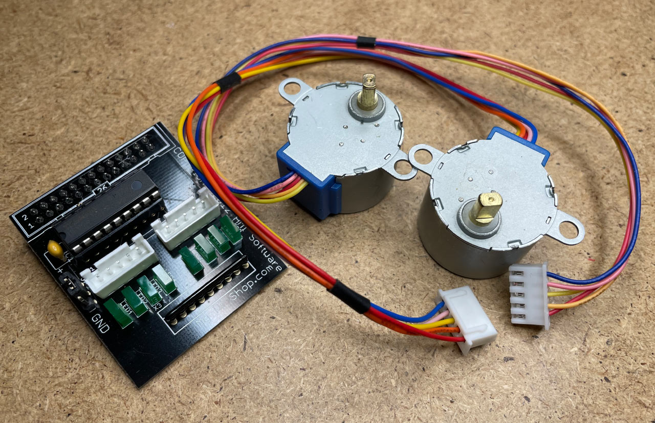 Für den Antrieb sind zwei Schrittmotoren zuständig. Da die Motoren für die Drehung der Ringe so gut wie keine Kraft brauchen, habe ich mich für sehr kleine Modelle vom Typ 28BYJ-48 entschieden. Die dazugehörige Motorsteuerung kann einfach auf den Raspberry Pi gesteckt werden. Der große Vorteil dieser Motoren ist, dass sie mit den 5V vom Raspberry Pi Netzteil auskommen und keine eigene Stromversorgung brauchen. Außerdem haben sie ein kleines Getriebe eingebaut, was für einen ruhigen Lauf der Uhr sehr vorteilhaft ist.