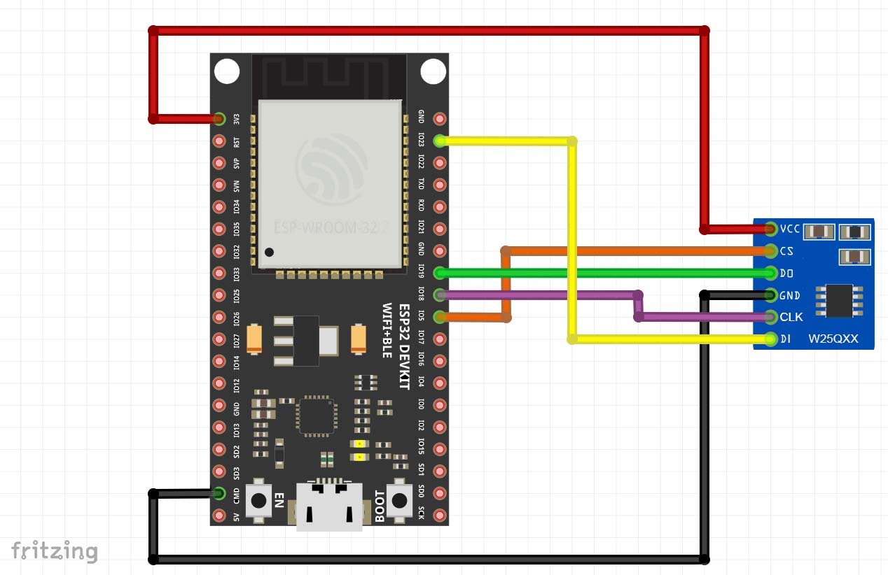 Die Daten mit den Zeitzonen sind zu groß, um direkt auf dem ESP32 Modul gespeichert werden zu können. Daher werden die Daten auf einem externen Winbond W25Q128 SPI Flash Chip gespeichert, der mit dem SPI3 (auch VSPI genannt) Controller des ESP32 verbunden ist.