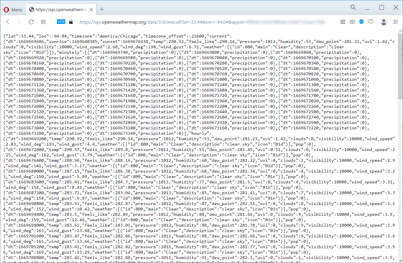 For my weather station I use the new API 3.0. It is a so-called "pay as you call" API, so you pay for each individual call. However, the first 1000 calls per day are free, which is more than enough for the weather station. After all, you can get the latest weather forecast every (24 * 60 * 60) / 1000 = 86.4 seconds. With a single call, you get the following data: