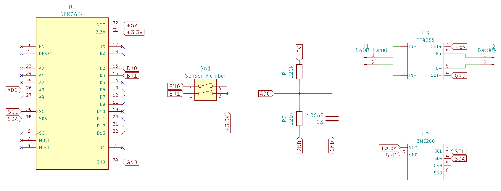 The circuit for the sensor module is very simple. It basically only consists of the connections of the individual modules. In addition, a voltage divider is integrated, with which the ESP32 can measure the current voltage. A DIP switch is used to assign a number to the sensor, which in turn controls the display on the base station.