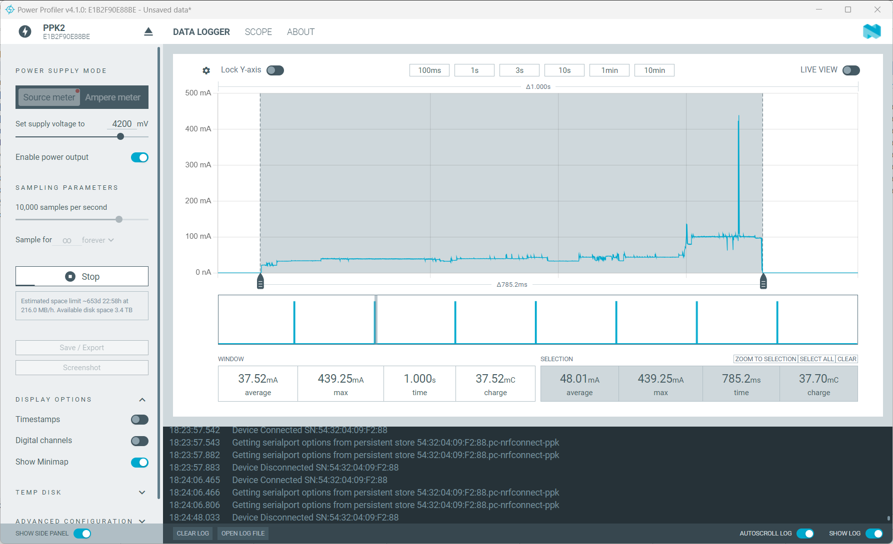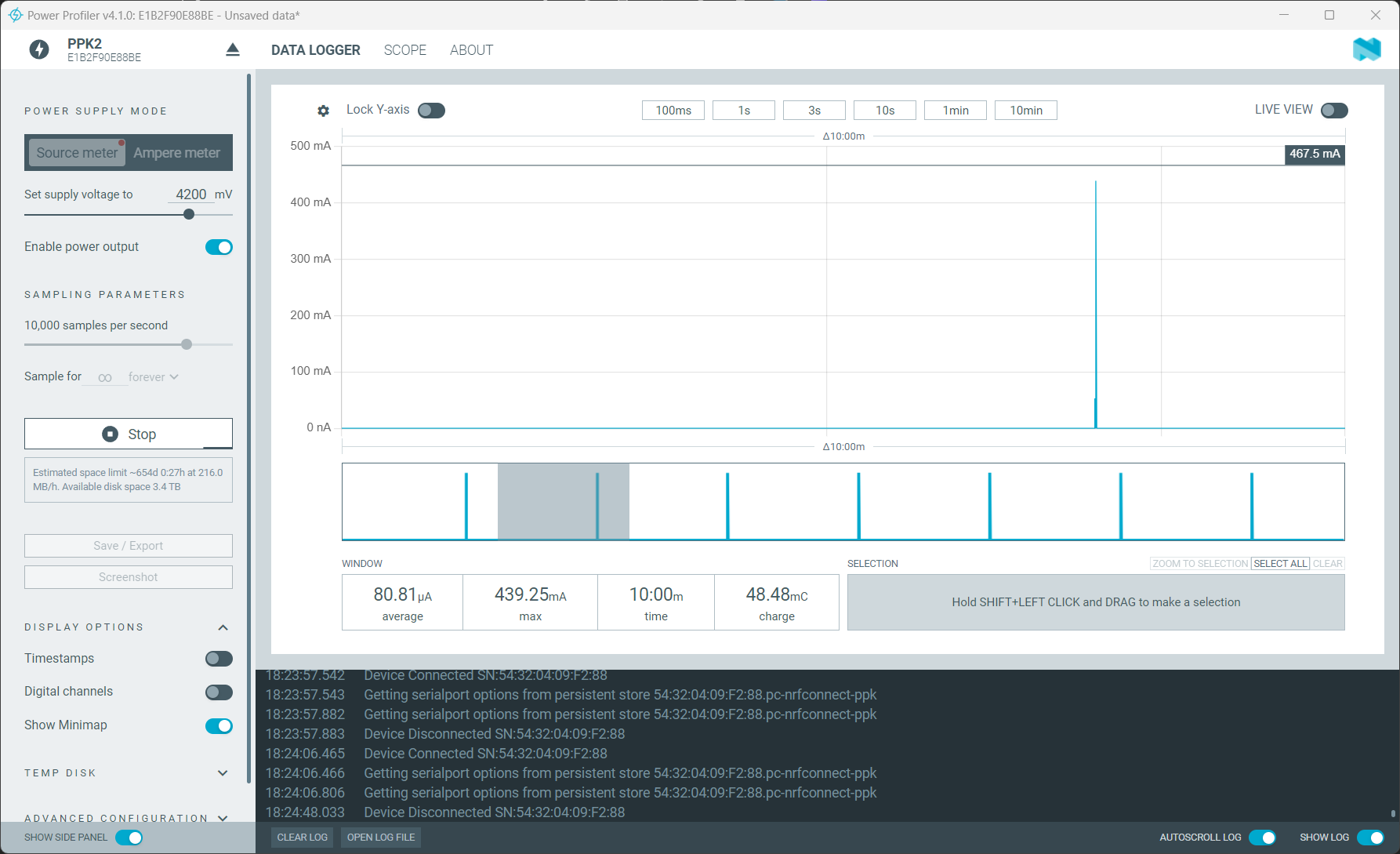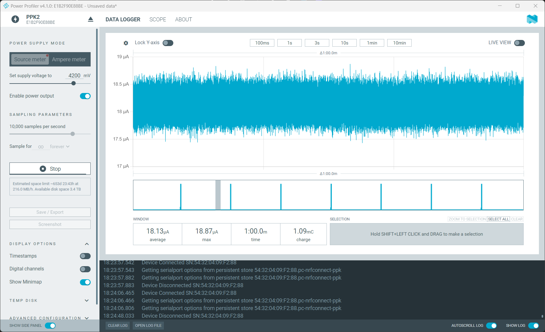 Of course, I also measured the power consumption of the FireBeetle board using the Power Profiler Kit II. Here are the results. First, the consumption in deep-sleep mode: