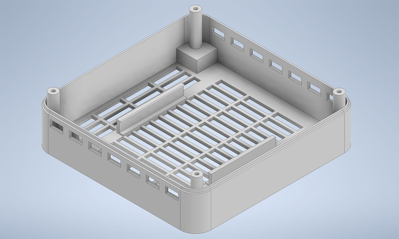 Naturally, a 120 mm fan does not fit in the original case. Therefore, I measured the case as accurately as possible and designed a new bottom. The new bottom has space for the fan and the SSD. To ensure the new bottom is not too high, I chose fans with a height of 15 mm. The design is as follows: