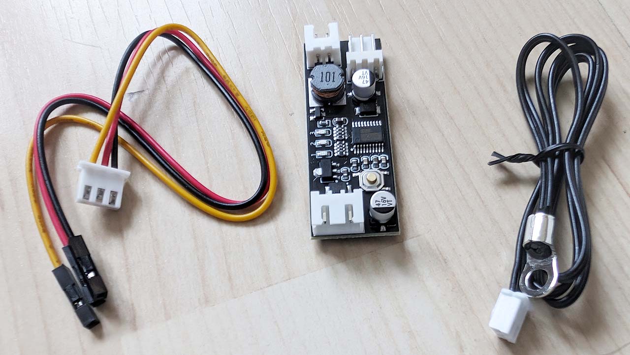 On Amazon, I found a small circuit board that is ideal for controlling the fan. A temperature sensor measures the temperature inside the case, and the fan is regulated accordingly. A small button even allows the control behavior to be configured.