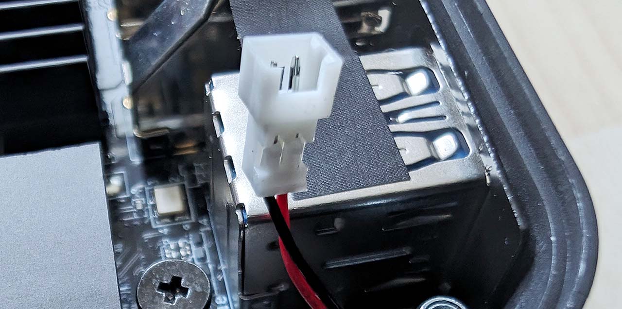 A very delicate point is the power supply. The cable inside the Minisforum computer is very short and uses a connector type that I unfortunately do not have. So, I built a different connector onto the cable that matches the fan controller. However, this was quite fiddly, so I opted for a more radical solution in variant 2. Here is a picture of the original connector: