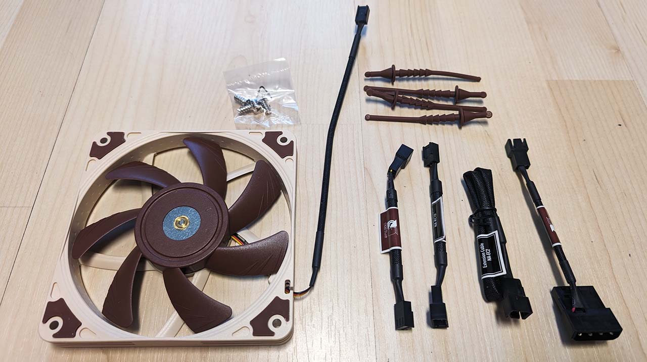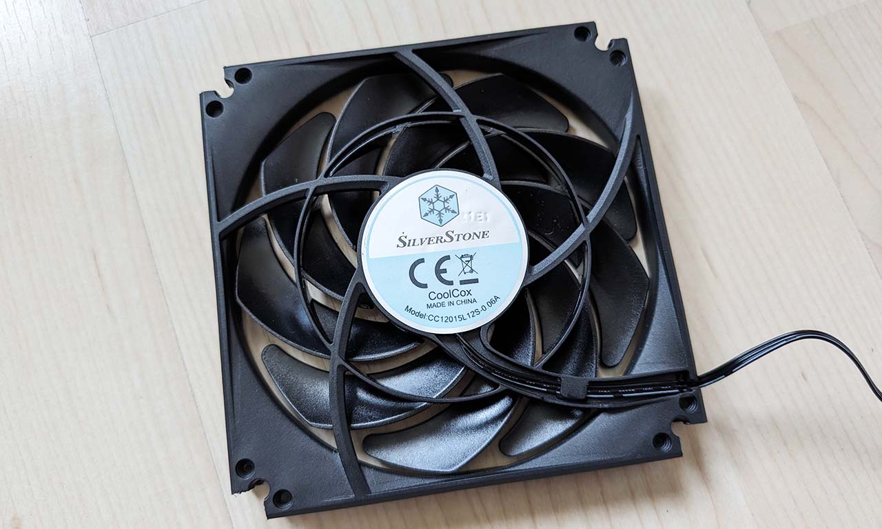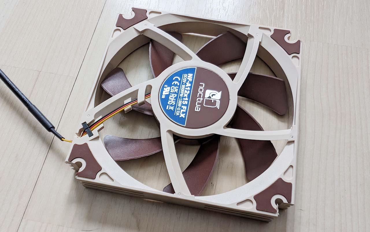 In my second variation, I forgo temperature-controlled fan speed regulation. Instead, I use the very quiet Noctua NF-A12x15 FLX, which comes with low-noise adapters that reduce its speed.