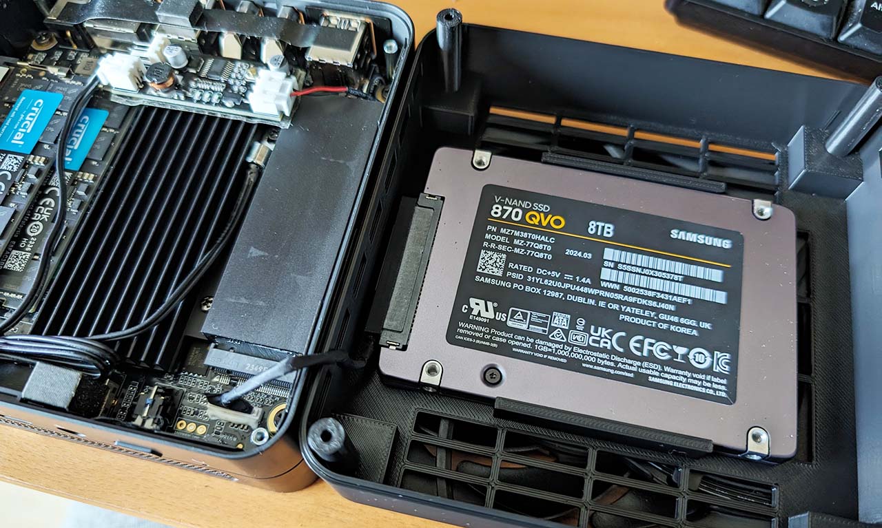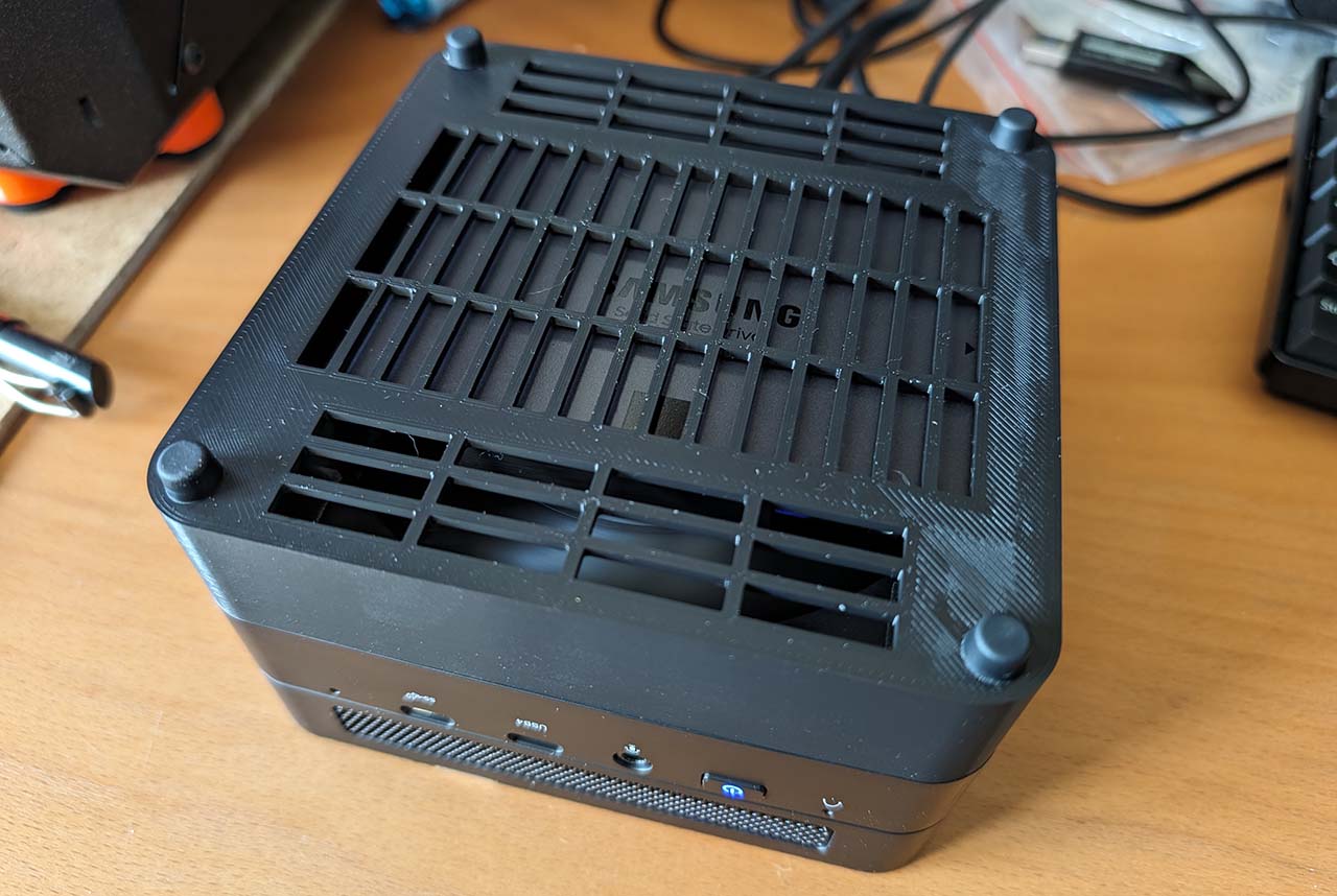 In the case, the SSD is mounted at the bottom in a holder, and the fan is installed above it. The STL file for printing can be downloaded from Printables.