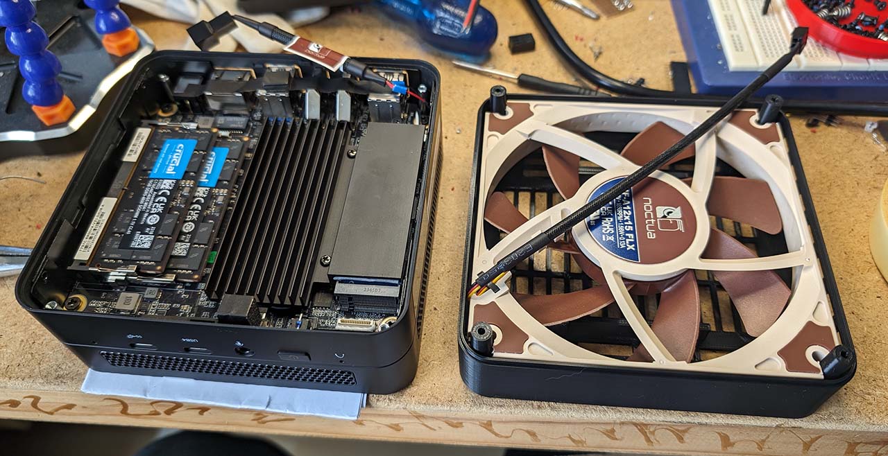 This is what the Minisforum UM690S looks like on the inside. The small fans run at a very high speed, making the computer unpleasantly loud. Therefore, I replaced the small fans with a large 120 mm fan. First, I tried a version with temperature-controlled fan speed, and then another version with a fixed speed.