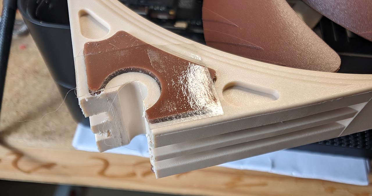 Another issue is the size of the fan. While it generally fits into the case, the four mounting tabs for securing the case are in the way. Therefore, I simply sawed off a piece from each corner of the fan to accommodate this.