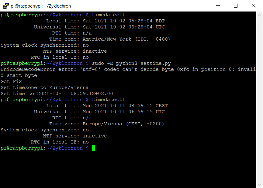 Since this Python script changes the time and time zone of the operating system, it must be started with root permissions. In addition, the sudo command must be executed with the -E option so that the installed Python modules are still found. The call looks like this, for example: